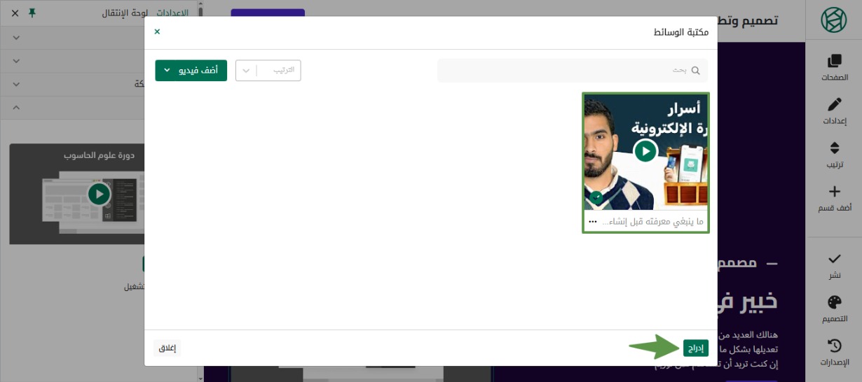 بعد إضافة رابط الفيديو سيظهر بهذا الشكل، اضغط على الفيديو المضاف ثم إدراج.