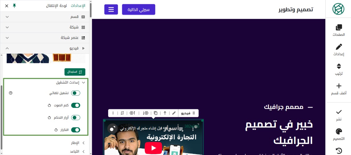 يمكنك التحكم في إعدادات تشغيل الفيديو على الموقع، من خلال تفعيل أو إلغاء تفعيل أي من الأيقونات الموجودة.