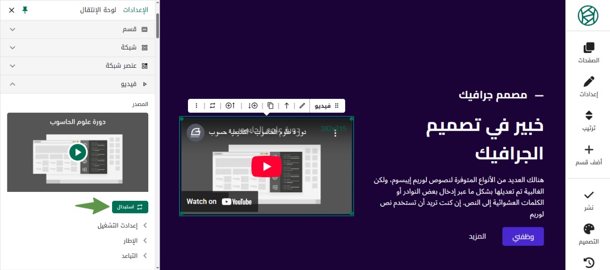 اضغط على استبدال، لاضافة رابط فيديو أو لرفع فيديو جديد.