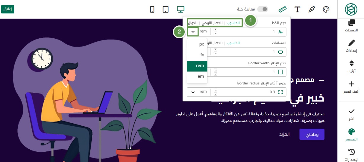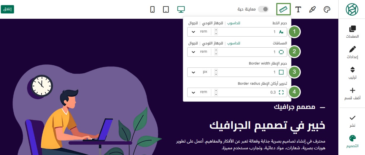 في الشريط الجانبي، اضغط على التصميم، ثم على أيقونة المسطرة المشار إليها لتخصيص الخيارات التالية: