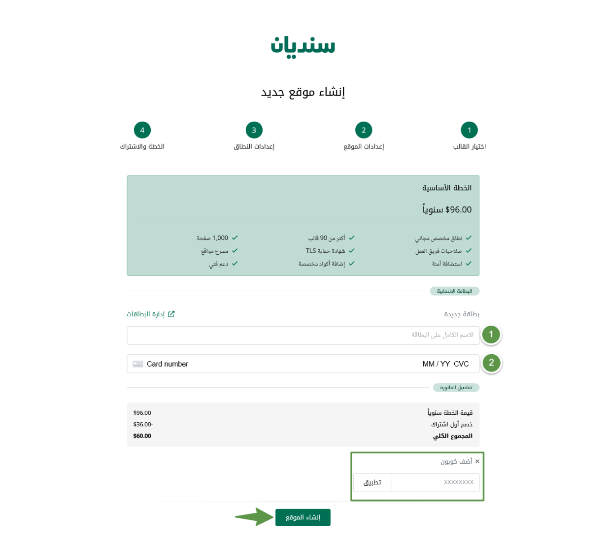 بعد تحديد بيانات الدفع سواء كان الدفع بالبطاقة الائتمانية أو إضافة كوبون، اضغط إنشاء الموقع.