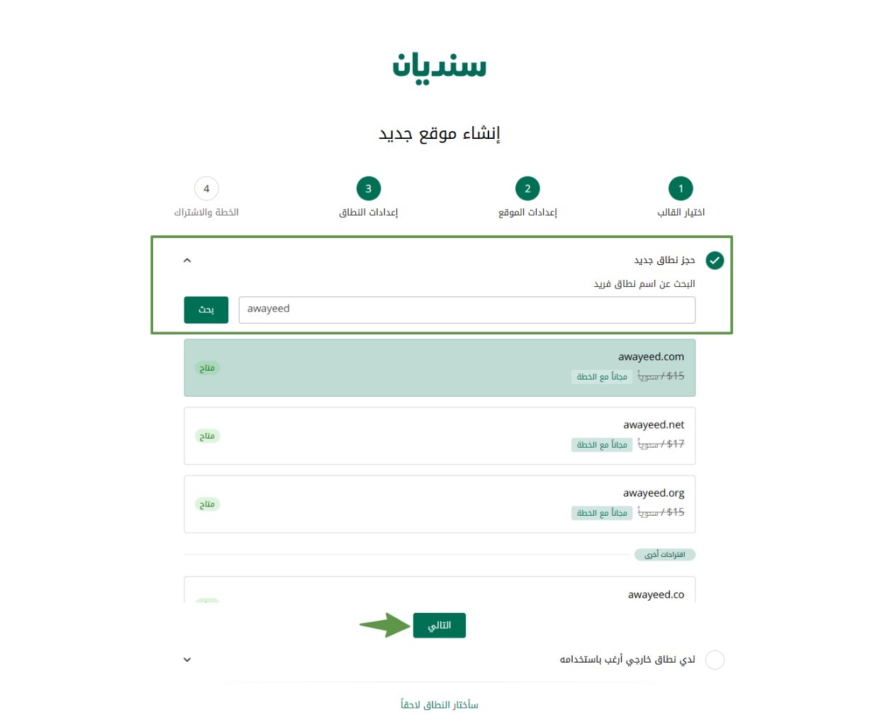 يمكنك البحث عن النطاق واختيار أحد النطاقات المتاحة، مع العلم أن بعض النطاقات قد تكون مدفوعة وبعضها مجاني مع الخطة.