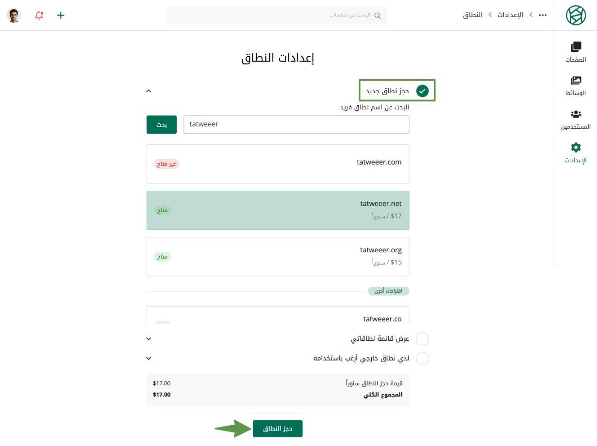 اضغط على حجز نطاق جديد، ثم قم بالبحث عن اسم النطاق المطلوب واختر أحد النطاقات المتاحة، ثم اضغط حجز النطاق.