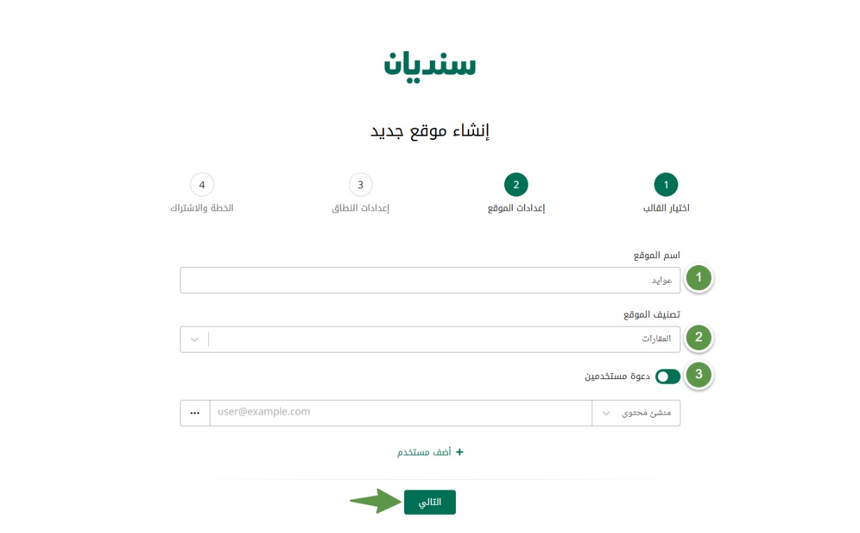 قم بتعبئة نموذج إنشاء الموقع، ثم اضغط التالي.