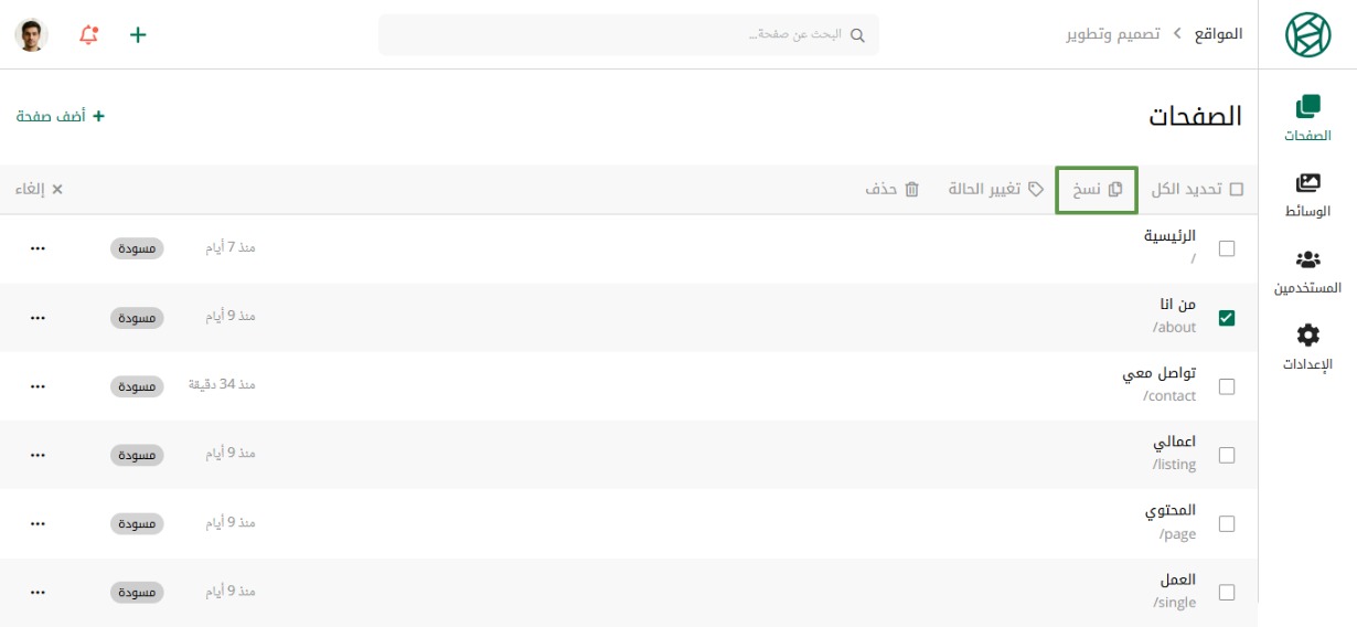 يمكنك اختيار الصفحة التي ترغب في نسخها، ثم اختيار نسخ من خيارات التعديل المتعدد.