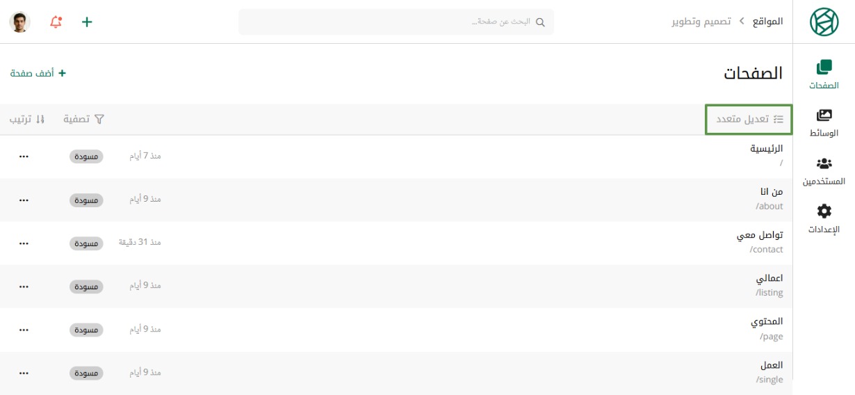 اضغط على تعديل متعدد، لتحديد الصفحات التي ترغب في نشرها.