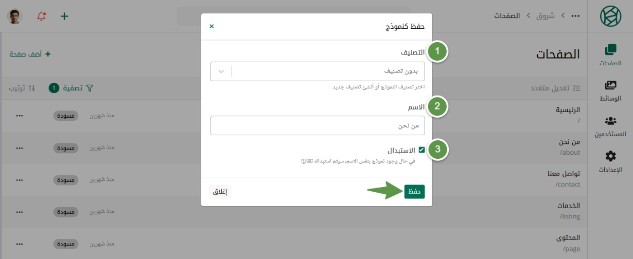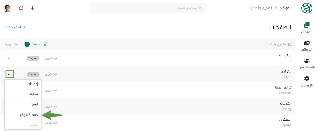 في صفحات الموقع، اضغط على الأيقونة الموضحة بجانب الصفحة المطلوبة، ثم اختر حفظ كنموذج.