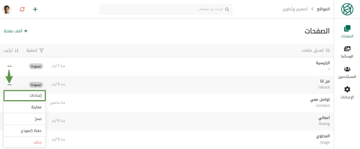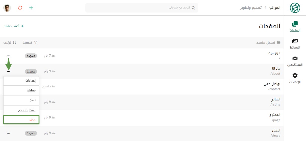 ملاحظة: يمكن حذف أي من صفحات الموقع عدا الصفحة الرئيسية وصفحات الخطأ.