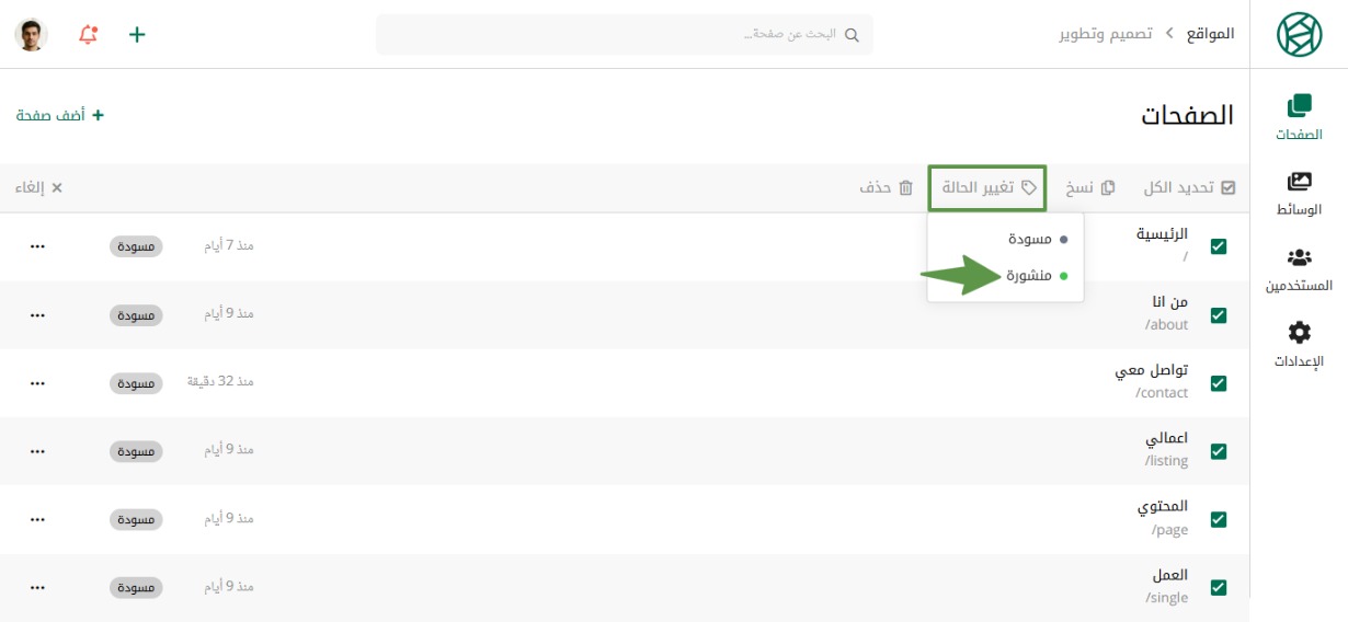 حدد الصفحات المطلوبة، ثم اضغط على تغيير الحالة، واختر الحالة لتكون منشورة.