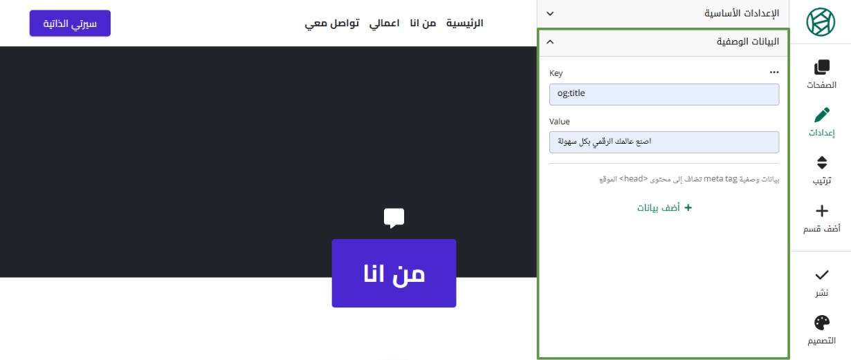 من قائمة البيانات الوصفية، يمكنك إضافة Meta Tags للصفحة لتحسين ظهورها في محركات البحث.