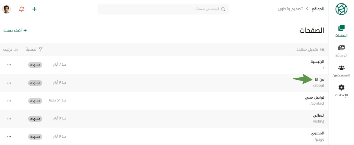 يمكنك الضغط على اسم الصفحة التي ترغب في تعديل المحتوى الخاص بها.