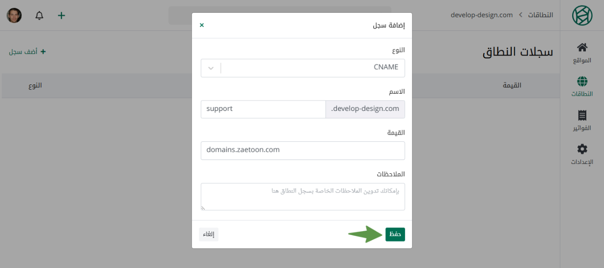قم بإدخال سجلات النطاق الفرعي، ثم اضغط حفظ.